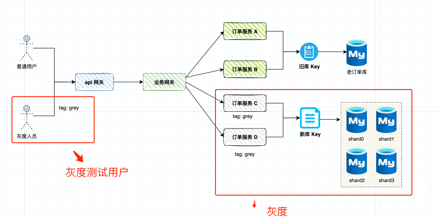 灰度的思路是订单服务 C、D 作为灰度服务,比如 Dubbo 服务中通过定义 tag 为 grey 。当灰度测试用户下单时,业务网关会将请求转向灰度订单服务。