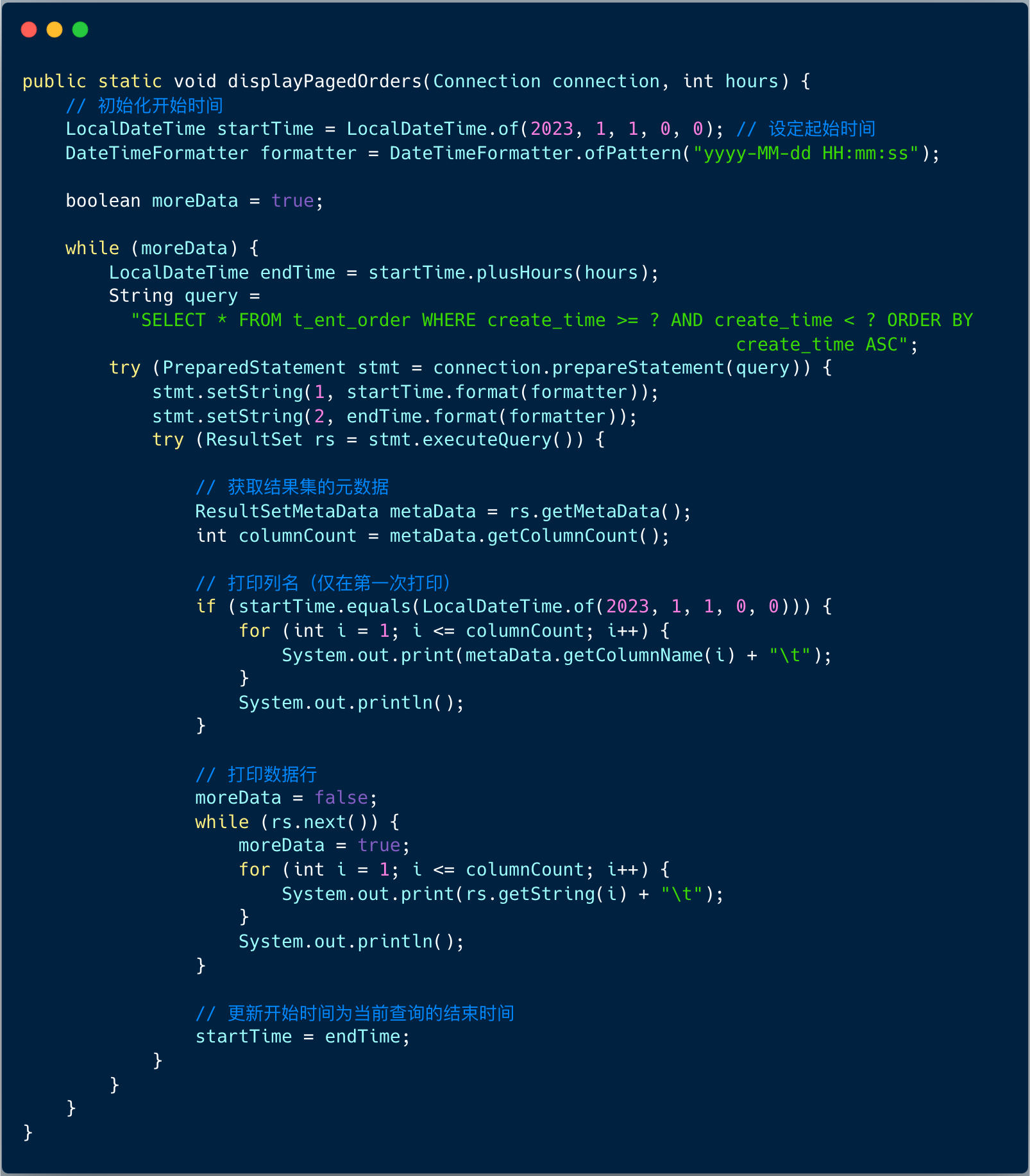 将数据按照时间分为多个片段,每次查询一个时间分片,这种方式和主键分页查询的目的是一样的,尽量减少每次查询的数据量,避免 OOM 的风险,同时也可以不断的按照顺序查询,避免出现数据丢失和重复。