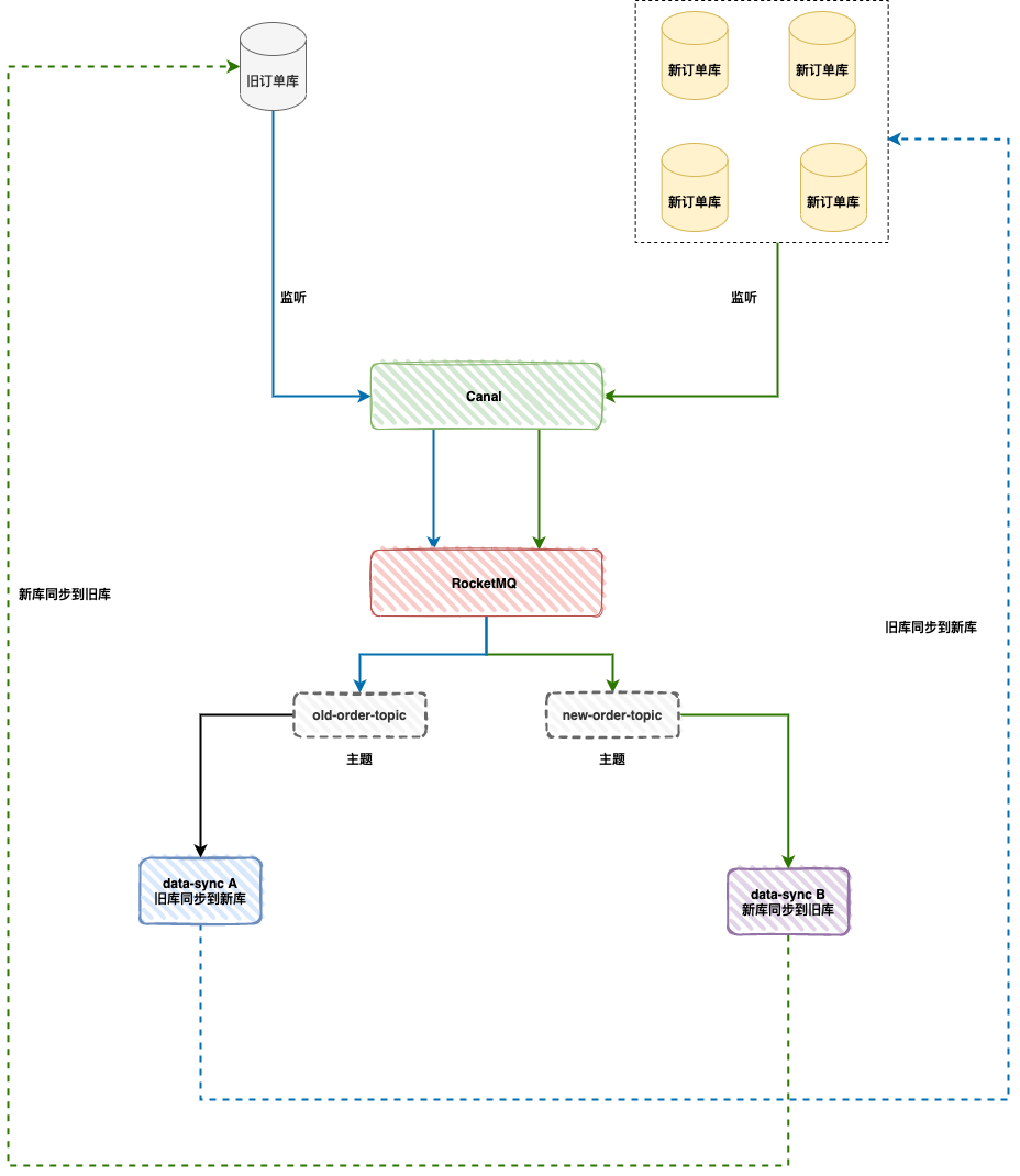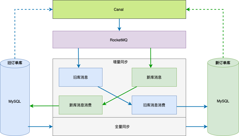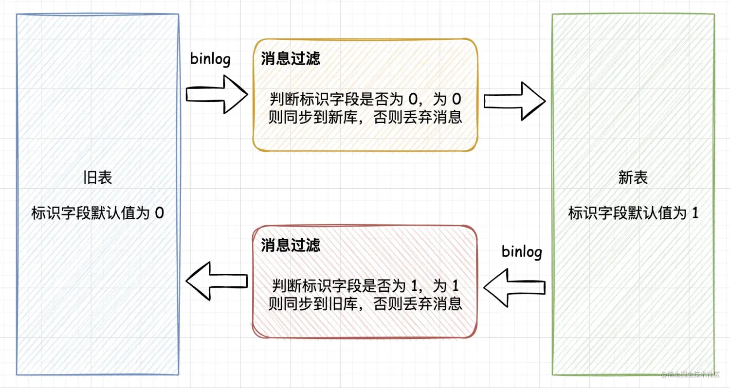 如下图,当旧库向新库同步时,消息过滤组件会判断标识字段是否为 0,如果为 0 则说明是旧库产生的数据,就同步到新库,否则就会丢弃消息。