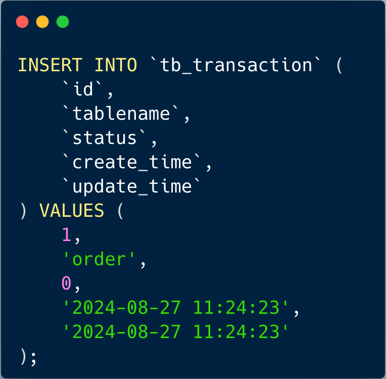 每个数据库实例中创建一个事务表,该事务表 tb_transaction 只有 id、tablename、status、create_time、update_time 几个字段,其中 status 默认为 0。