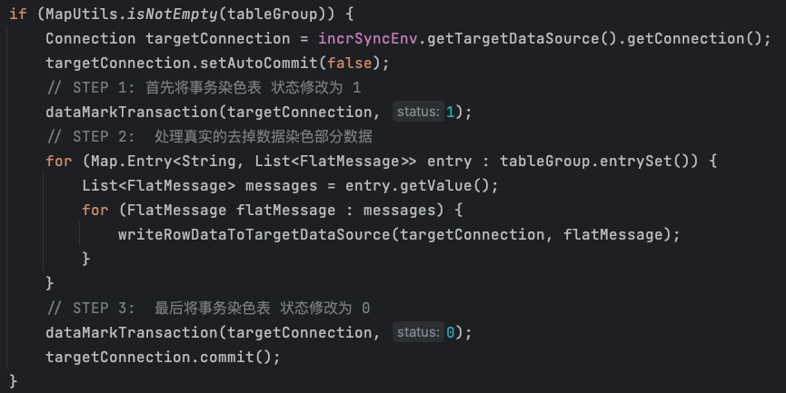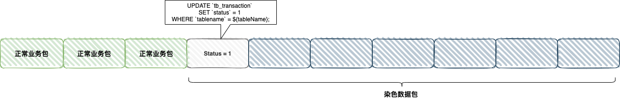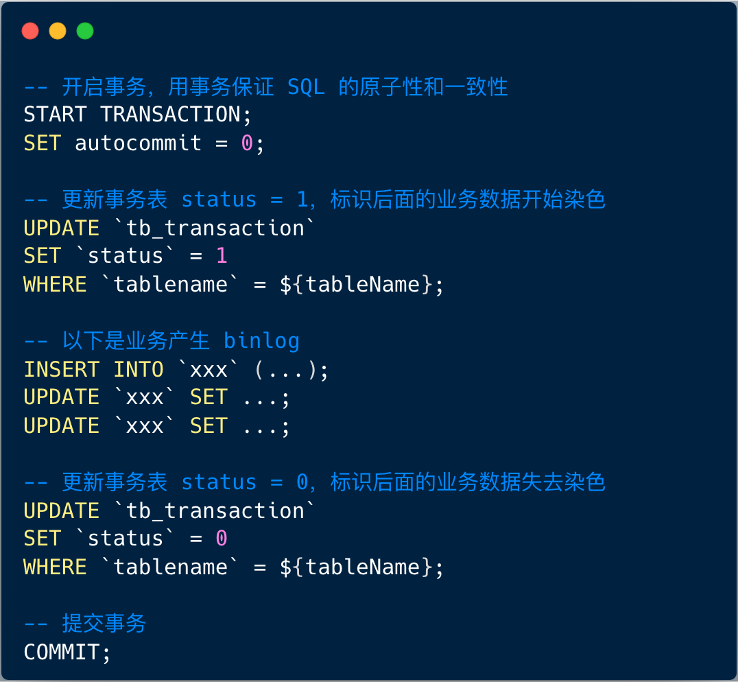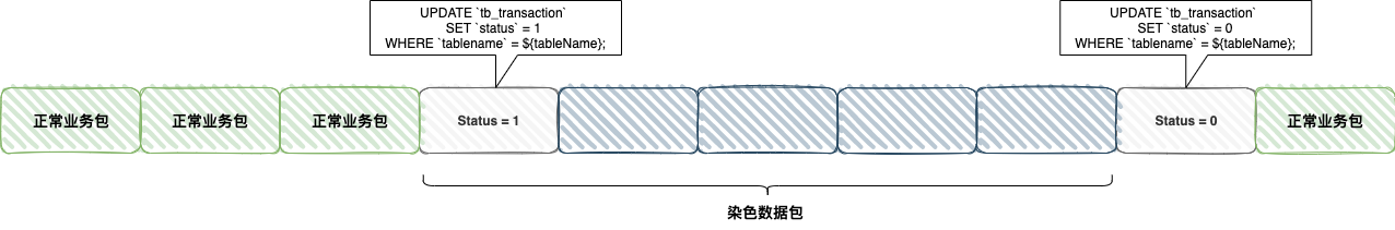2、data-sync 中间件接到 binlog 后,遇到 「status =1」 直到 「status =0」之间的染色数据则不予处理,同时将正常业务数据包按照如下的 SQL 执行: