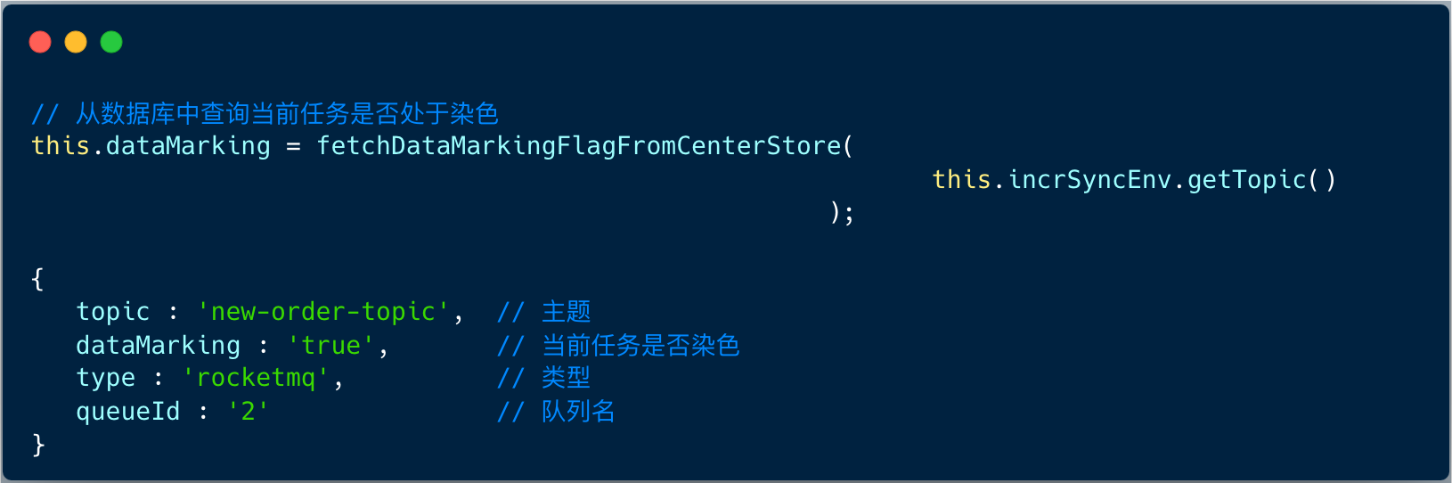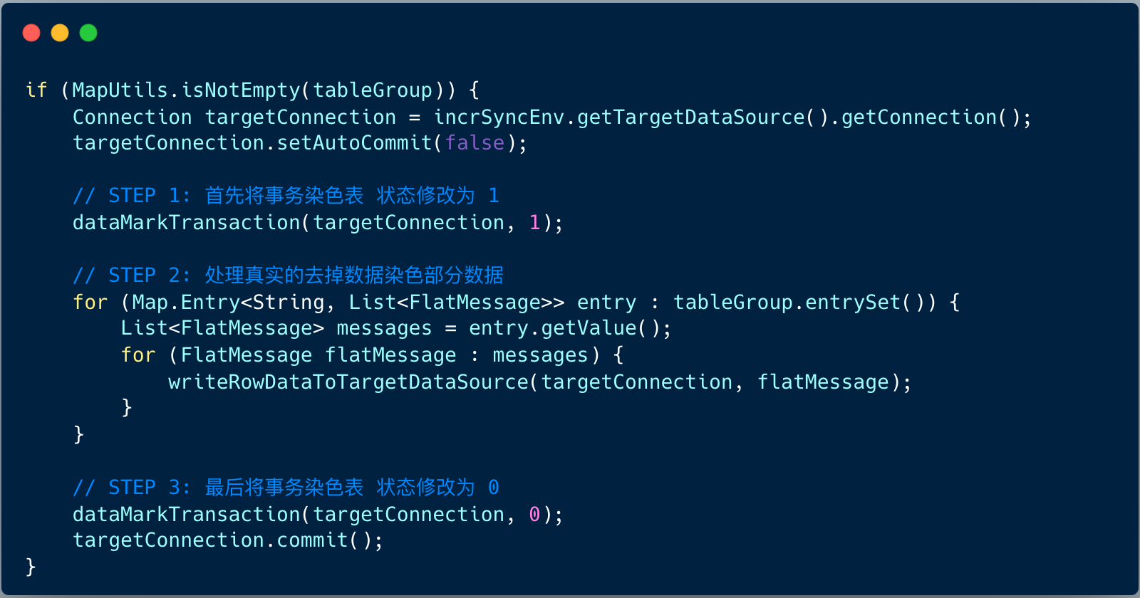 解决方案是: 数据染色,所谓数据染色,即:标识写入到数据库中的数据是 data-sync 中间件写入的而不是业务写入,当下次接收到该 binlog 数据的时候就不需要进行再次消息流转。
