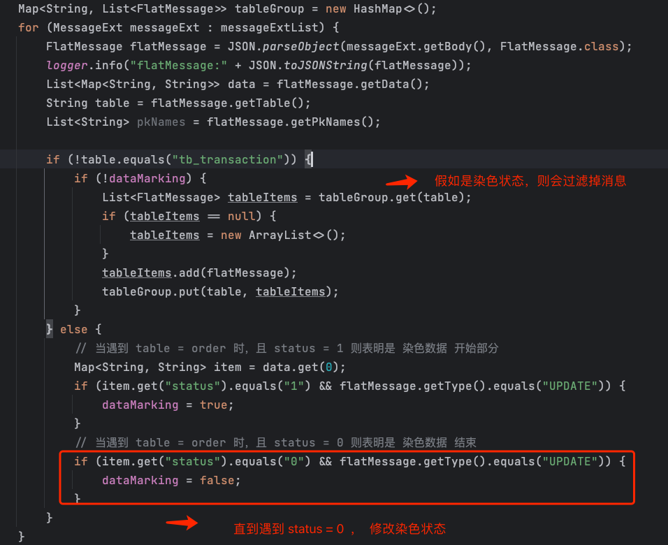 首先将消息做过滤,按照表名做一个分组,过滤掉染色消息。
