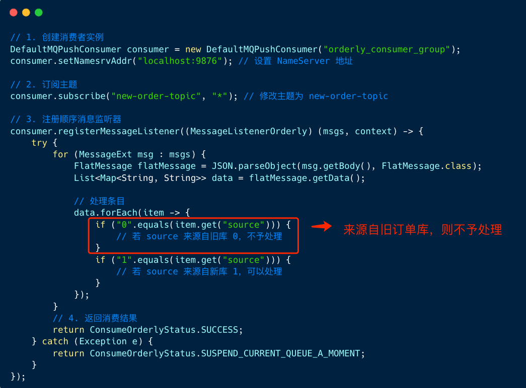 2、顺序消费时,只需要判断 source 字段是否和当前操作库一致,若一致,则不予处理,过滤掉。