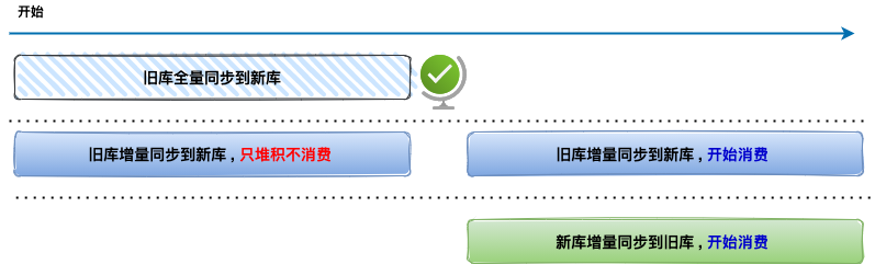 当历史全量数据同步完成后,然后开启消费 RocketMQ 消息进行增量数据同步(提高全量同步效率减少积压也是关键的一环),这样来保证迁移数据过程中的数据一致。