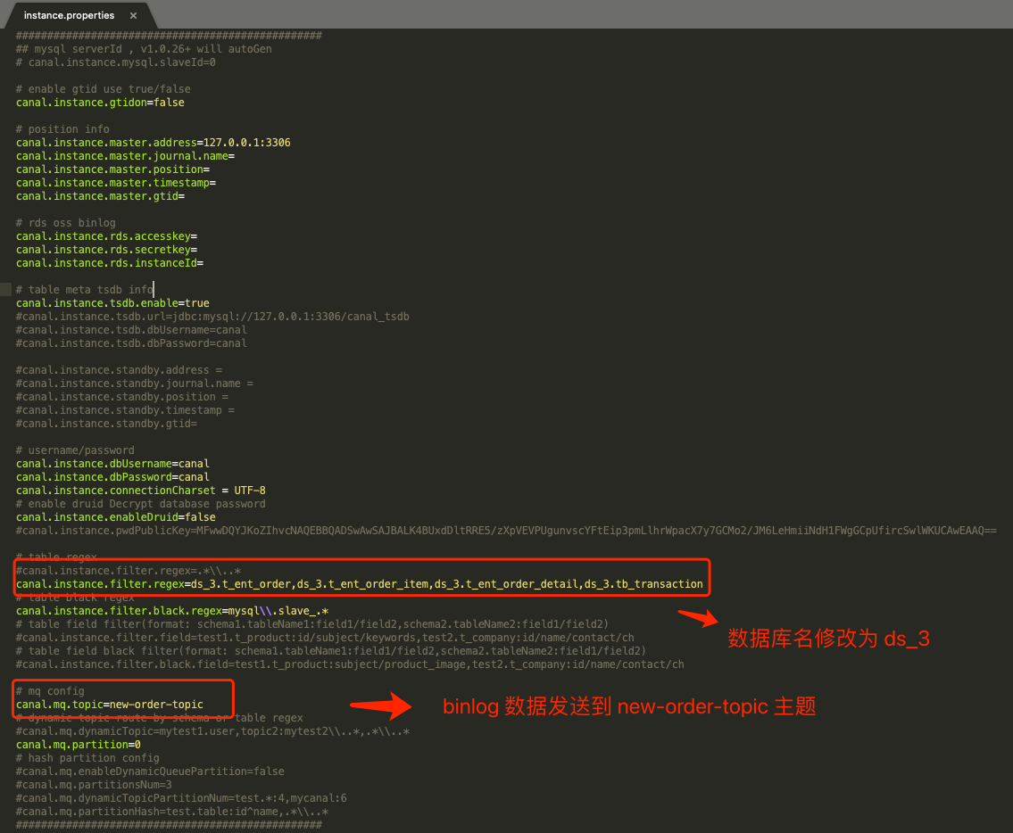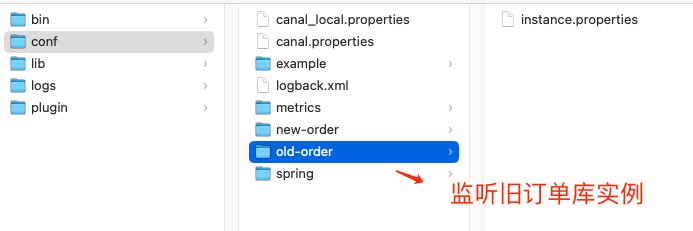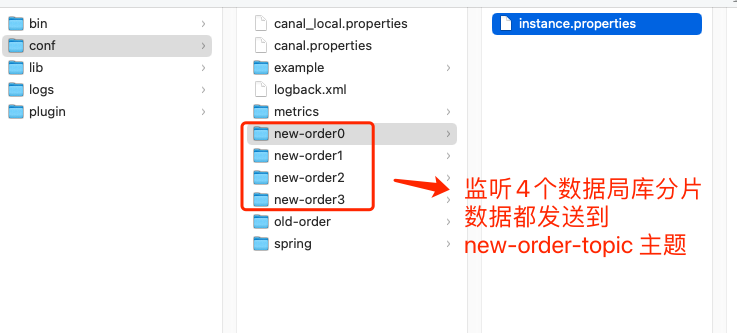 Canal 使用的模式是 RocketMQ ,我们定义了两个 instance 列表 old-order、new-order ,它们分别代表了「监听旧订单库」、「监听新订单库四个分片」。