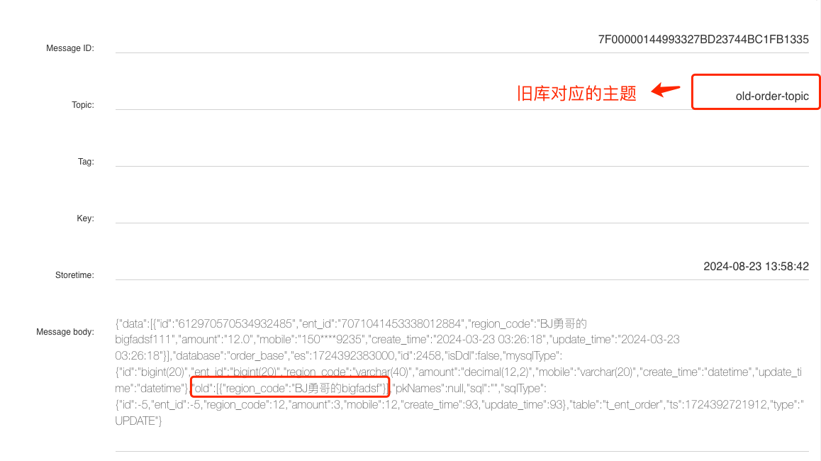 接下来,我们同样修改新订单分片 ds_3 订单表的一条记录,从 RocketMQ 控制台即可查询出该条 Binlog 消息: