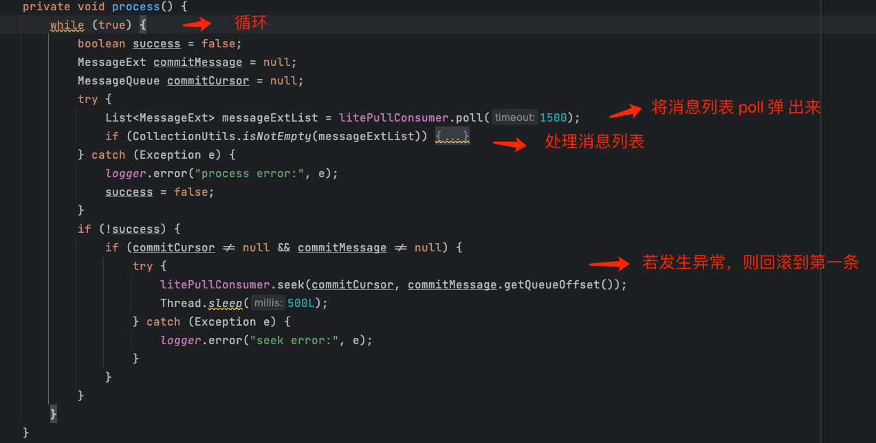 这个例子里使用的是 DefaultLitePullConsumer , 当出现异常时,我们会重置消费位点到当前批次的第一条消息,重新开始消费。