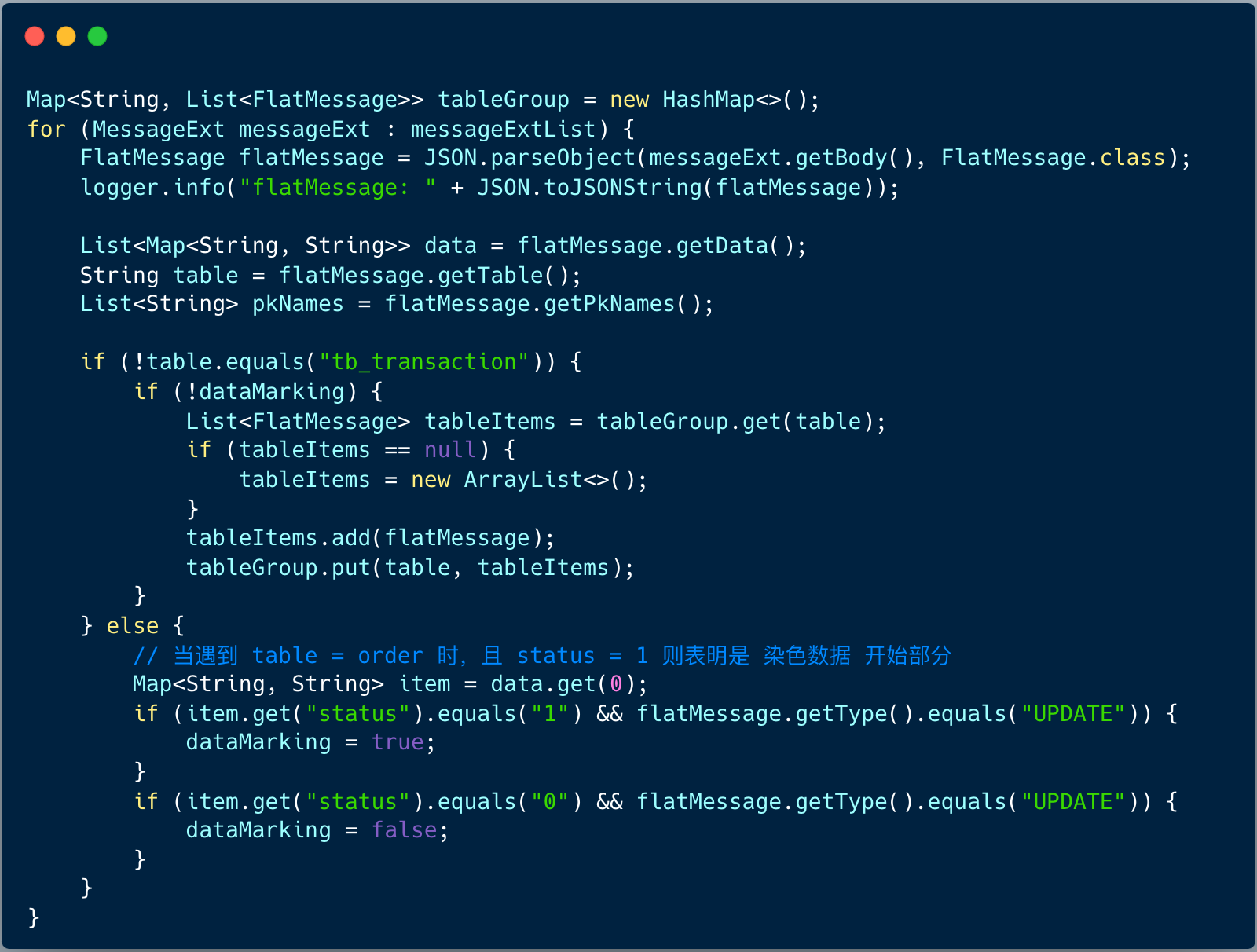 图中,我们定义了顺序消费者,遍历消息列表,先将消息解析成 FlatMessage ,处理 FlatMessage 的 data 对象, 遍历 data 对象的条目,解析 source 字段,若 source 和当前库一致(都为 0 ),则不予处理。