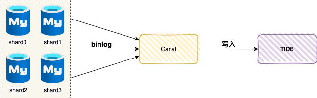 因为 TIDB 兼容 MySQL 5.7 协议 ,我们可以把 TiDB 当做一个可以自动扩缩容的 MySQL 。TIDB 存储所有订单数据的全集,同步方案大同小异,都是全量同步 + 增量同步。
