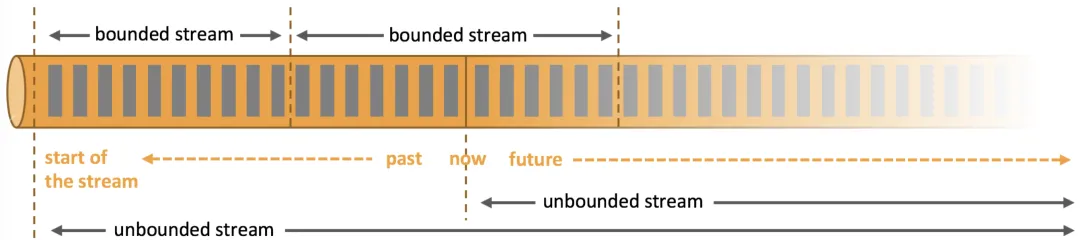 - 流计算:针对无界流,永远无法看到输入数据的整体,数据的输入无法看到结束,数据到达就计算,输出当时(实时)的计算结果;输出结果也是一个无界流;数据到达也可以理解为可以把无界流变成有界流在计算,比如时间划分,数据量划分。