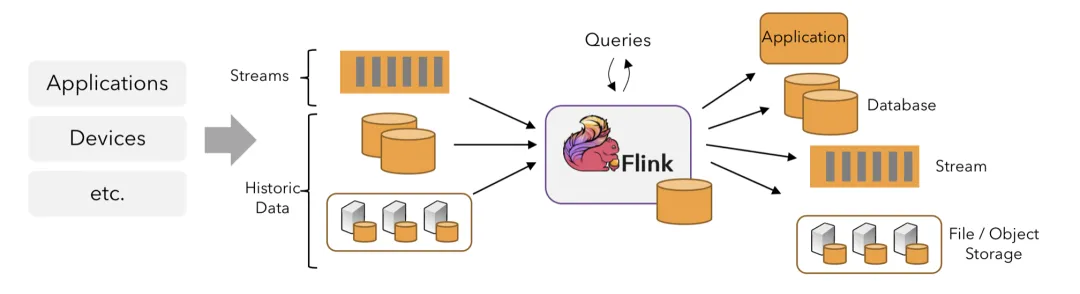 Flink应用程序可以消费来自消息队列或分布式日志这类流式数据源(例如Apache Kafka或Kinesis)的实时数据,也可以从各种数据源中消费有界的历史数据。同样,Flink应用程序生成的结果流也可以发送到各种数据存储系统中(例如数据库、对象存储等)。