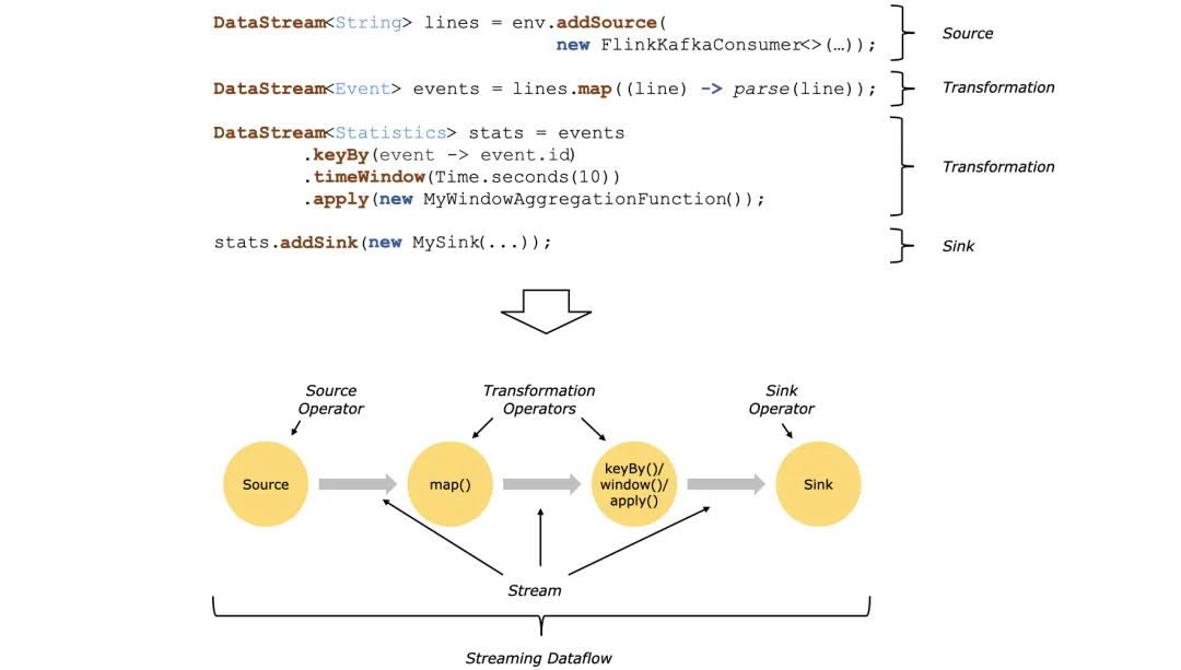 一个Flink应用程序由3部分构成,或者说将Flink的操作算子可以分成3部分,分别为Source、Transformation和Sink。