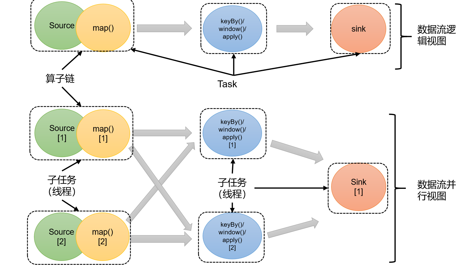 在Flink执行过程中,每一个算子(operator)可以包含一个或多个子任务(operator subtask),这些子任务在不同的线程、不同的物理机或不同的容器中完全独立地执行。