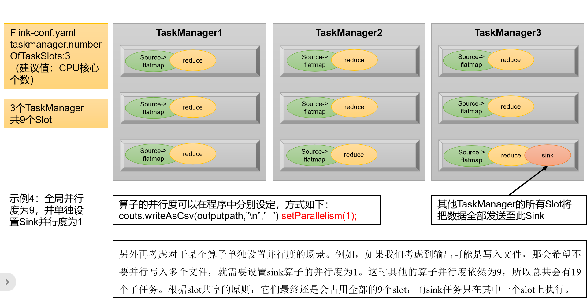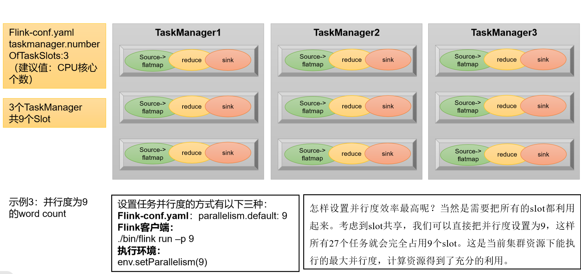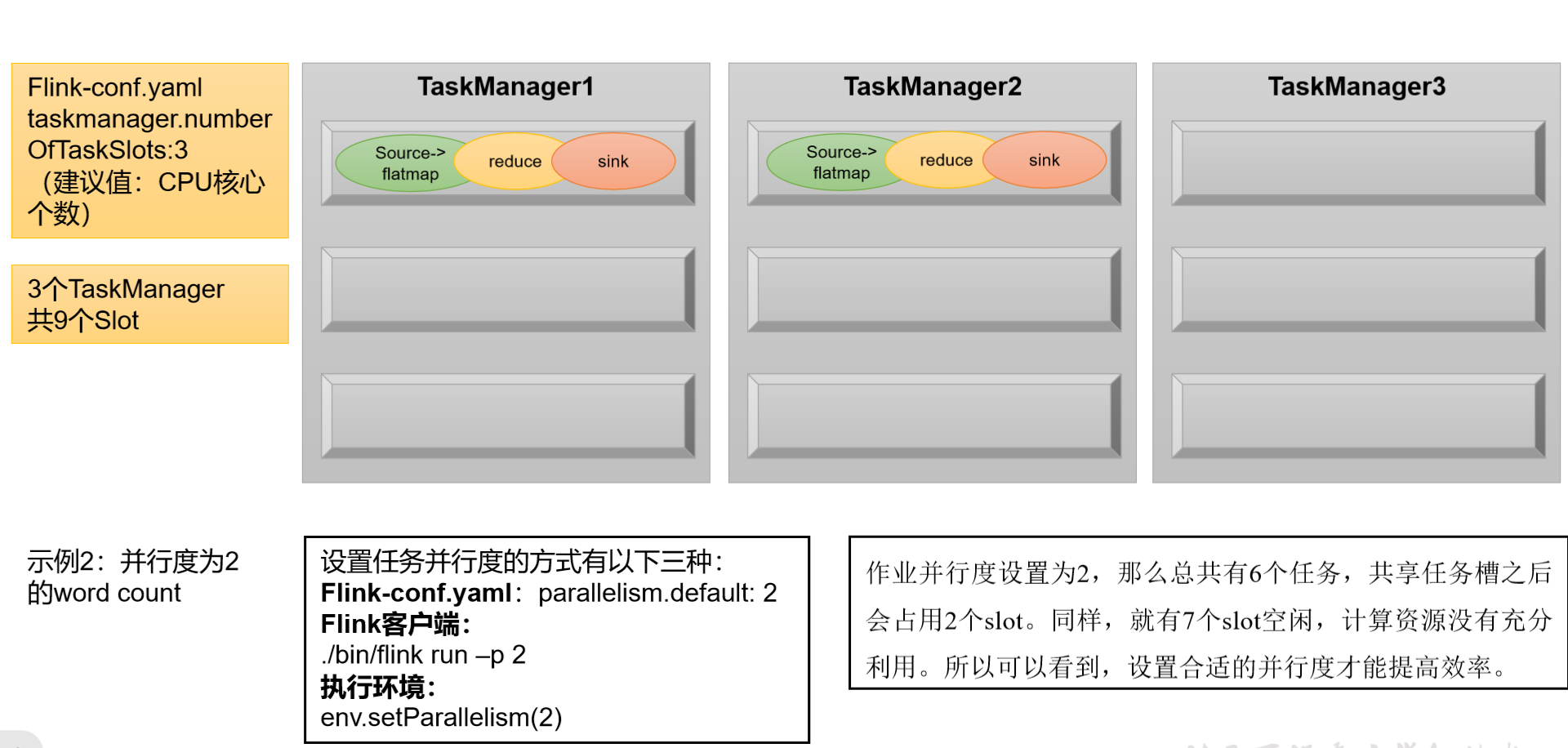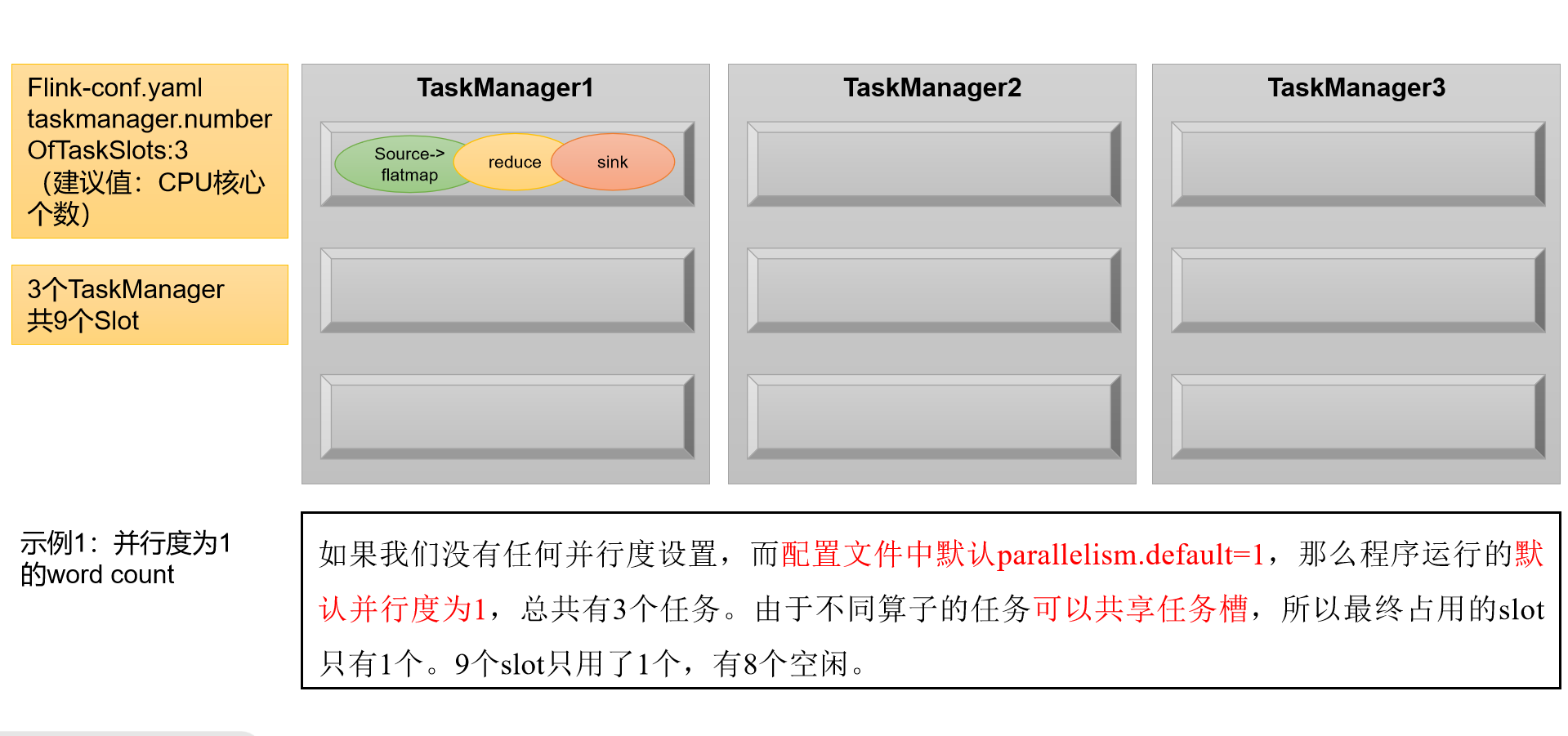 举例说明:假设一共有3个TaskManager,每一个TaskManager中的slot数量设置为3个,那么一共有9个task slot,表示集群最多能并行执行9个同一算子的子任务。