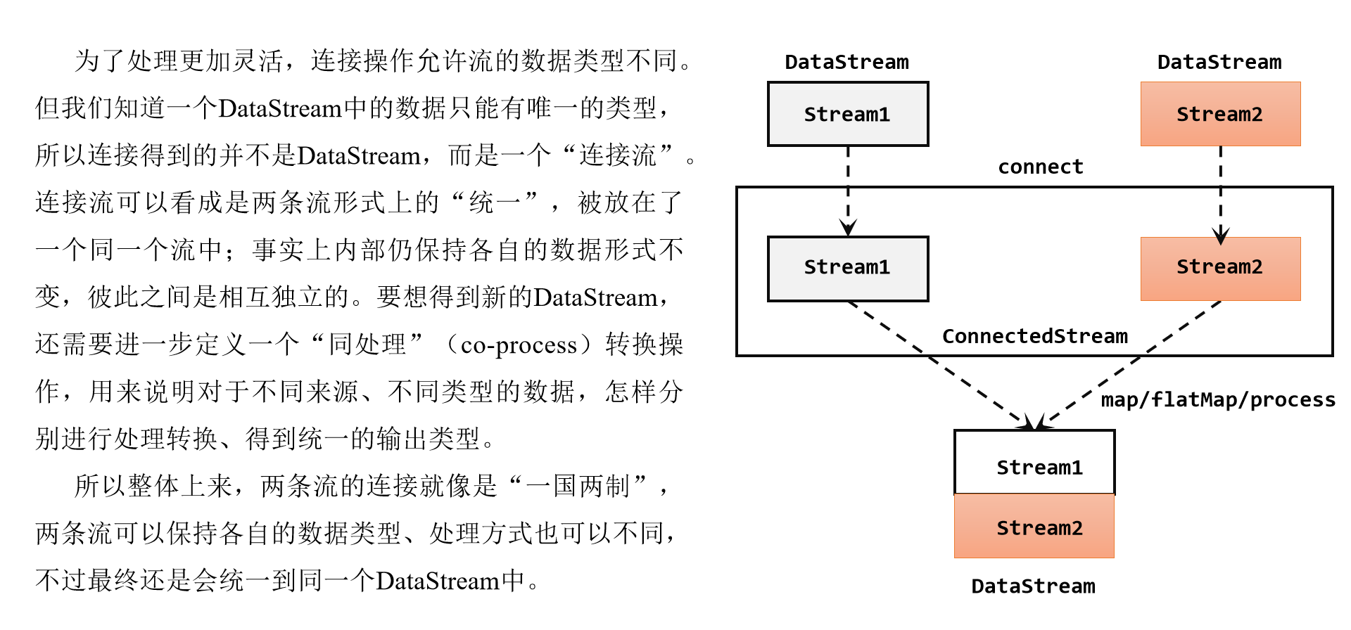 流的联合虽然简单,不过受限于数据类型不能改变,灵活性大打折扣,所以实际应用较少出现。除了联合(union),Flink还提供了另外一种方便的合流操作——连接(connect)。