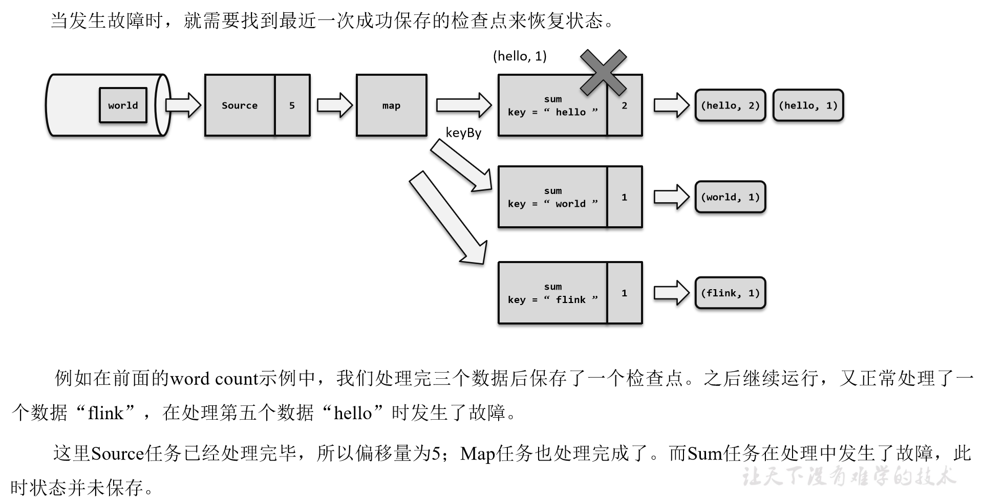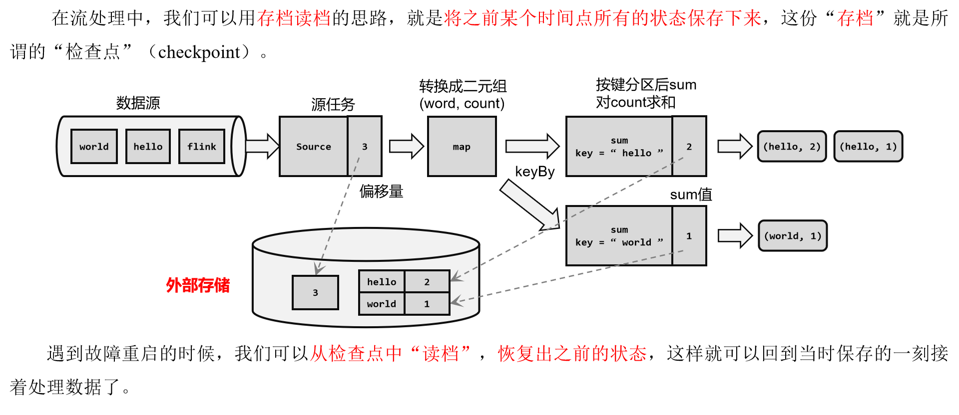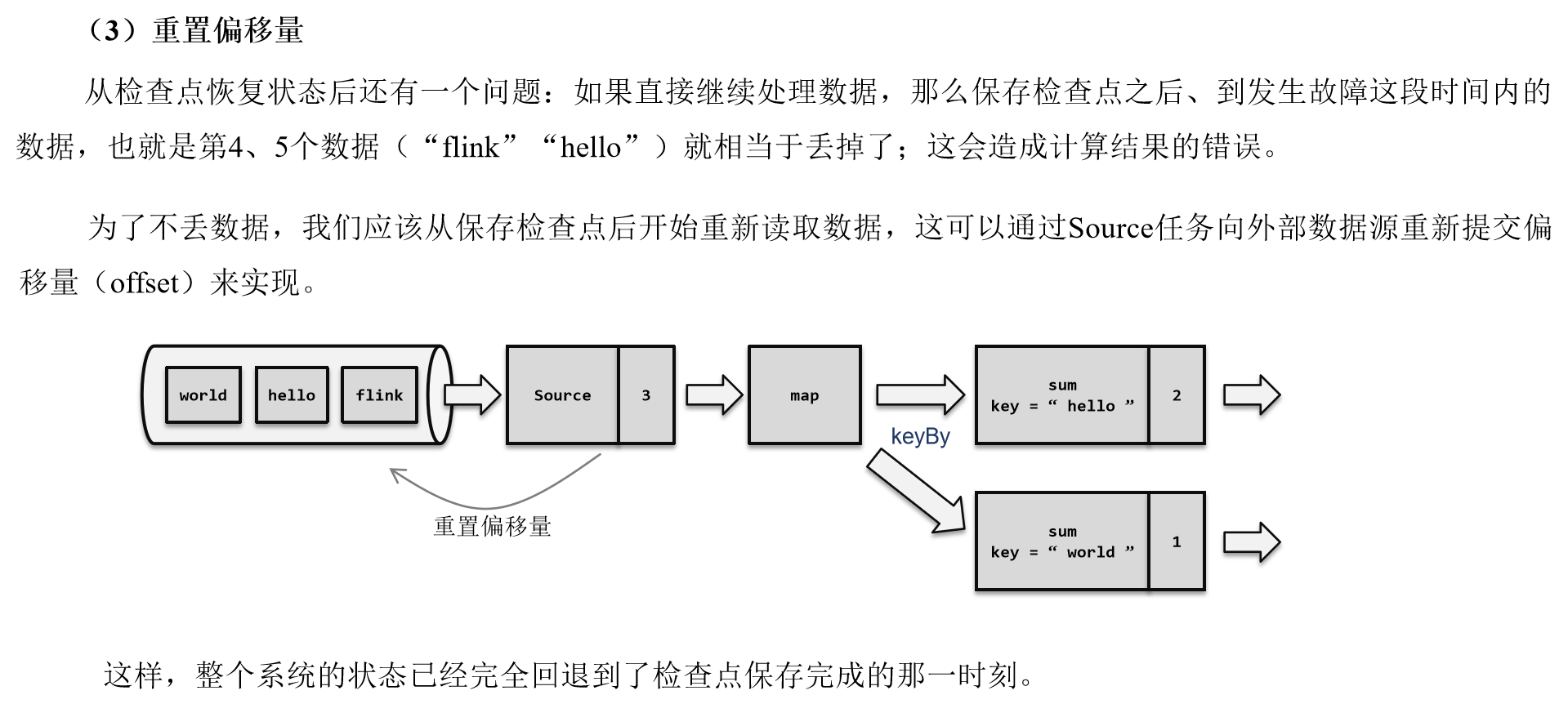 如果出现故障,我们恢复到之前保存的状态,故障时正在处理的所有数据都需要重新处理;我们只需要让源(source)任务向数据源重新提交偏移量、请求重放数据就可以了。当然这需要源任务可以把偏移量作为算子状态保存下来,而且外部数据源能够重置偏移量;kafka就是满足这些要求的一个最好的例子。