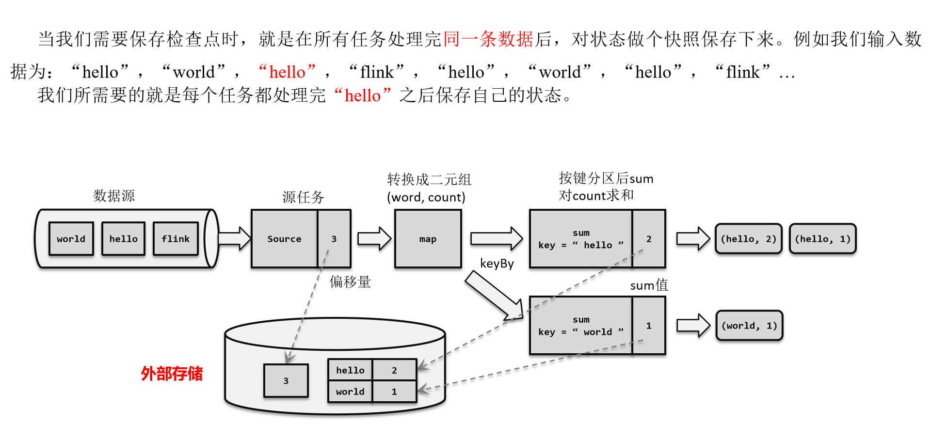 检查点的保存,最关键的就是要等所有任务将“同一个数据”处理完毕。下面我们通过一个具体的例子,来详细描述一下检查点具体的保存过程。