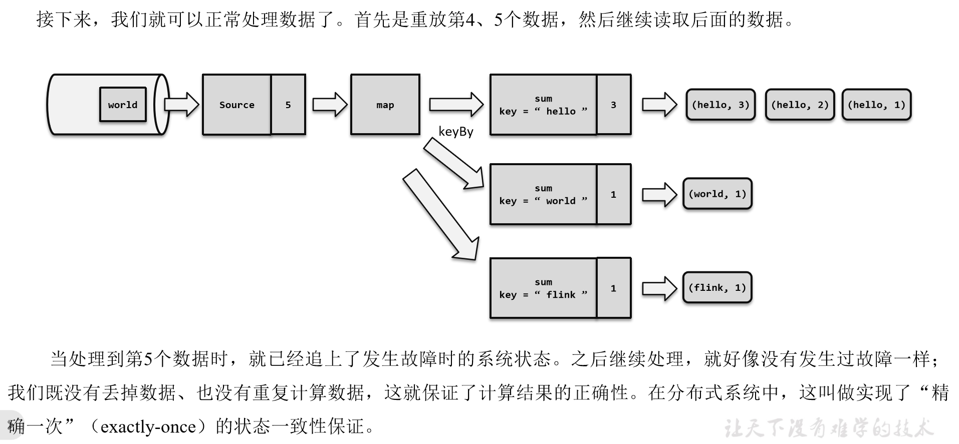 实际应用中,最难做到、也最希望做到的一致性语义,无疑就是端到端(end-to-end)的“精确一次”。我们知道,对于Flink内部来说,检查点机制可以保证故障恢复后数据不丢(在能够重放的前提下),并且只处理一次,所以已经可以做到exactly-once的一致性语义了。