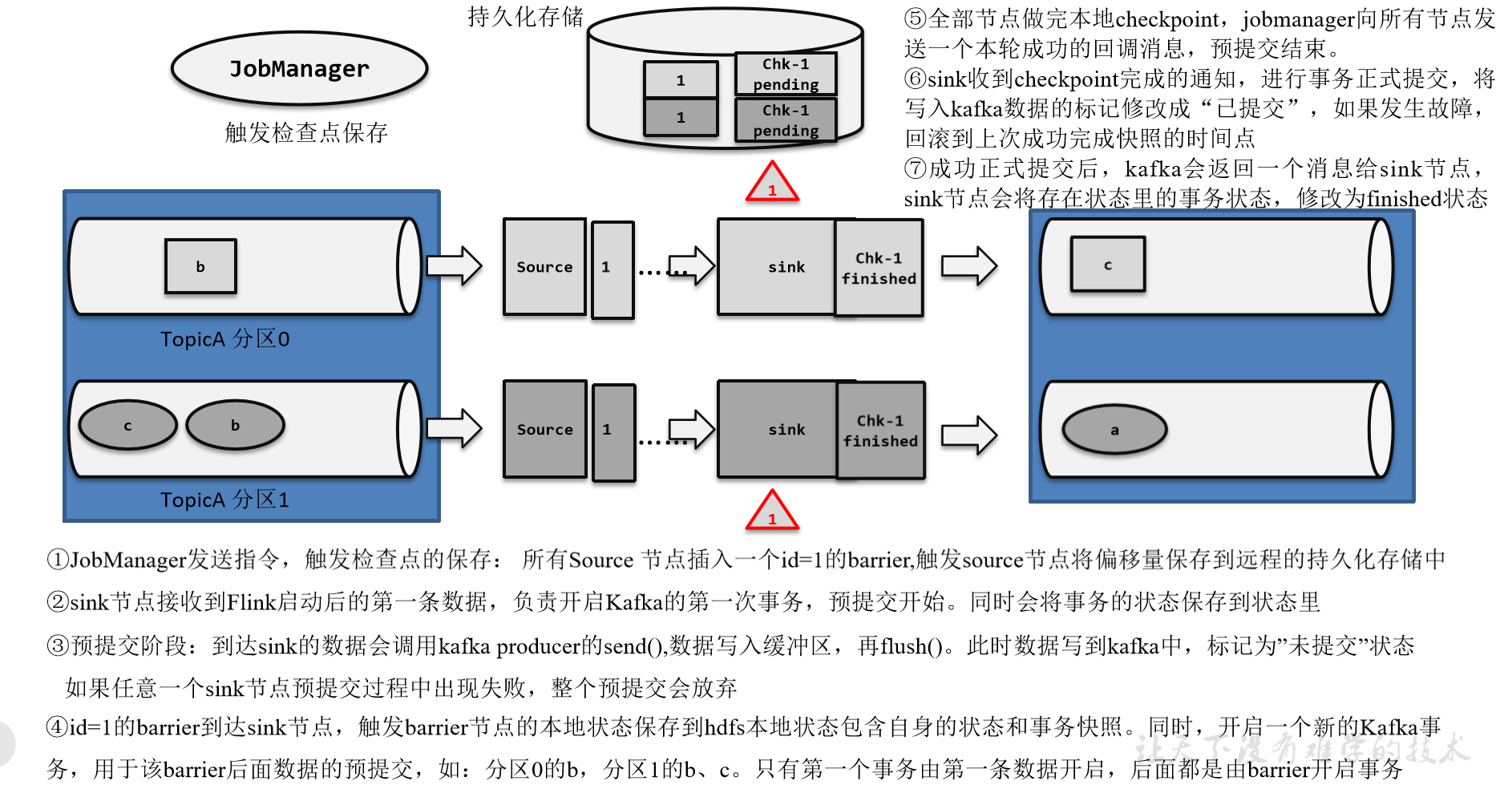 ④在成功写入所有数据后,在内部再次确认相应的检查点,将确认信息也进行持久化保存。这才代表着检查点的真正完成。