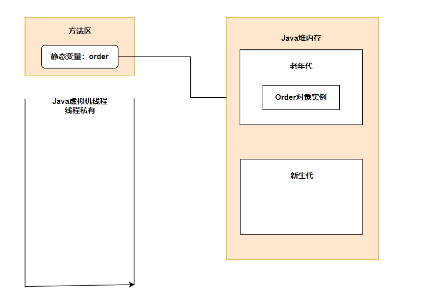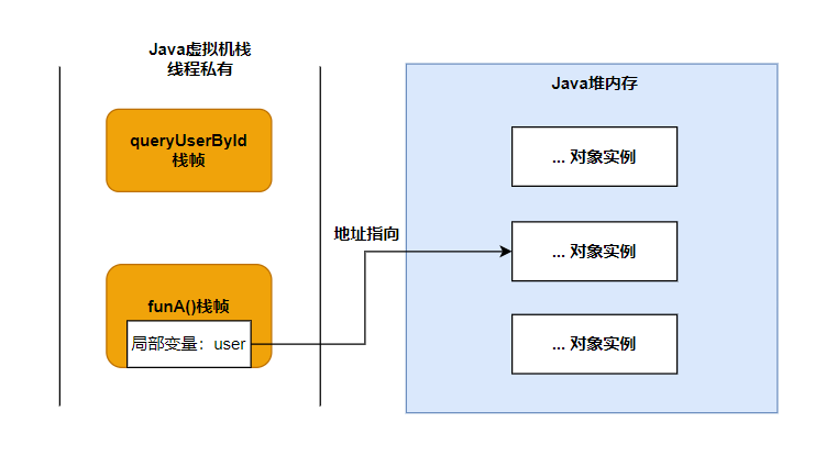 以上代码是一个很简答的示例,funA中有一个User对象,通过User对象调用了它的queryUserById方法。此时当前线程的虚拟机栈中就会有funA与queryUserById两个方法的栈帧。但是有个问题,new出来的User对象在哪里呢?