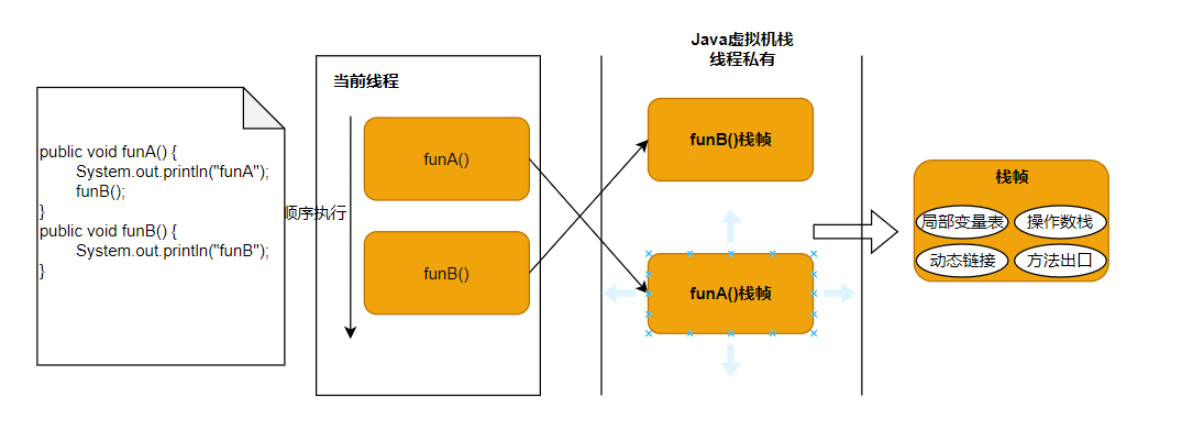 「比如一个线程在执行funA()时,就会将funA(),就会往当前线程的Java虚拟机栈中放一个栈帧,当执行到funB()时,又会往Java虚拟机栈放一个栈帧」。如下: