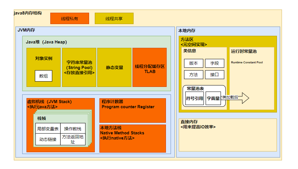此时就需要使用到JVM中另外一块内存区域了【Java堆内存】,「堆内存是JVM中所管理的最大的一块内存区域,并且是所有线程共享的一块内存区域,堆内存区域的目的就是存放对象实例,在1.7的时候将【字符串常量池】【静态变量】都放进了堆中,这在上面那种图中也有体现」。