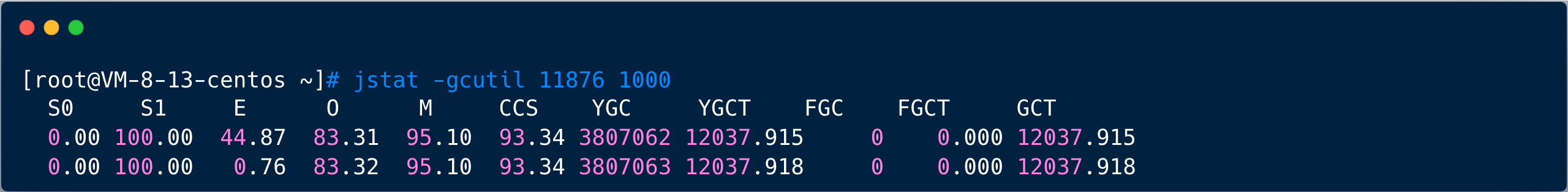 2、通过 jstat 命令的 gcutil 参数详细打印堆内存的信息,并每隔 1 秒打印一次
