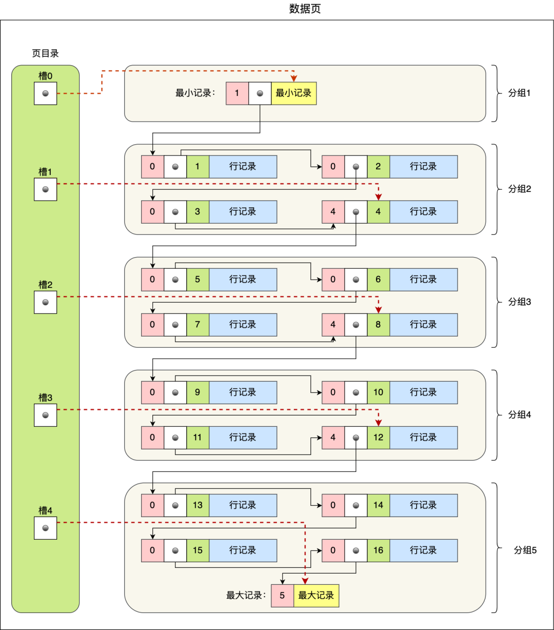 - 每个记录组的最后一条记录就是组内最大的那条记录,并且最后一条记录的头信息中会存储该组一共有多少条记录,作为 n_owned 字段(上图中粉红色字段)
