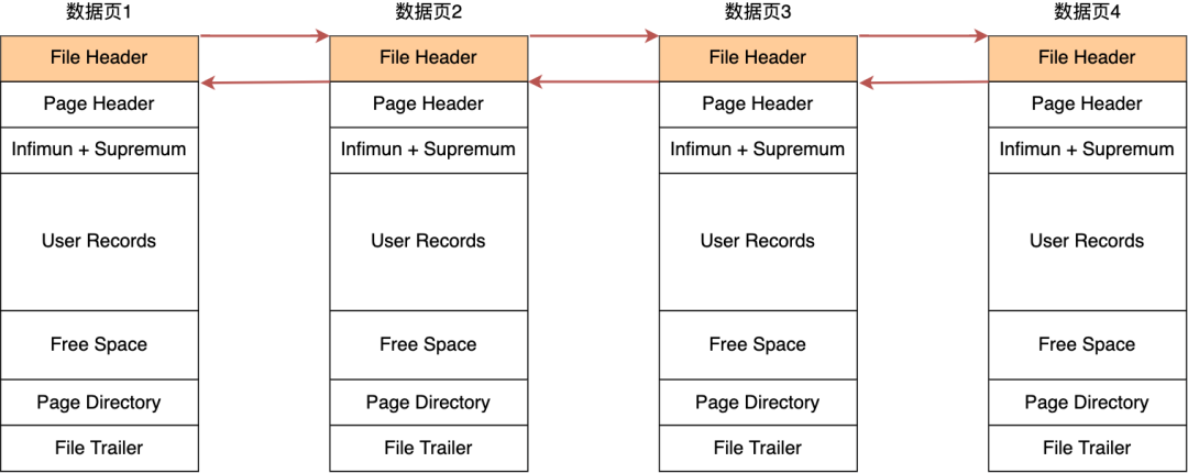 在 File Header 中有两个指针,分别指向上一个数据页和下一个数据页,连接起来的页相当于一个双向的链表,如下图所示: