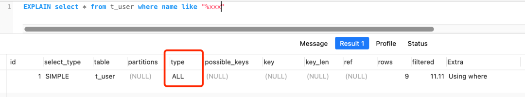 而第三和第四条会发生索引失效,执行计划的结果 type= ALL,代表了全表扫描。