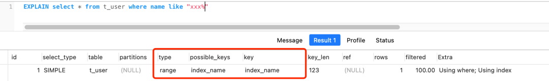 这四条模糊匹配的查询语句,第一条和第二条都会走索引扫描,而且都是选择扫描二级索引(index_name),我贴个第二条查询语句的执行计划结果图: