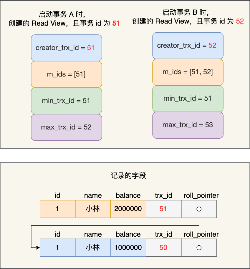 假设事务 A (事务 id 为51)启动后,紧接着事务 B (事务 id 为52)也启动了,那这两个事务创建的 Read View 如下: