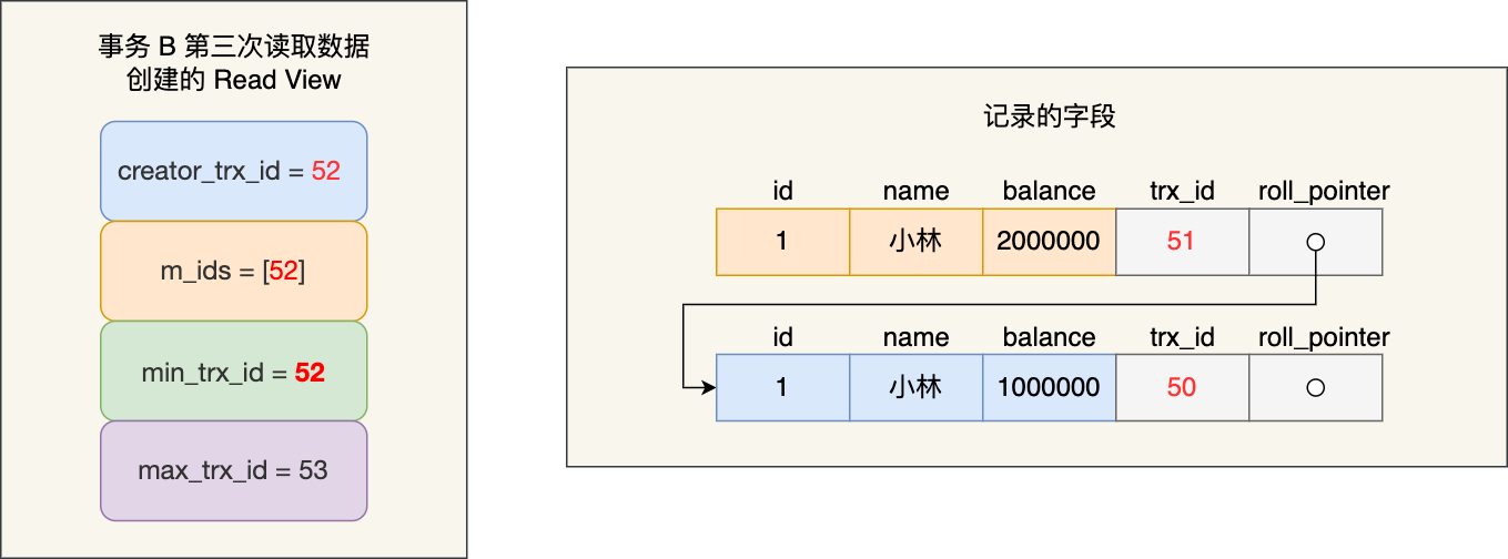 事务 B 在找到小林这条记录时,会发现这条记录的 trx_id 是 51,比事务 B 的 Read View 中的 min_trx_id 值(52)还小,这意味着修改这条记录的事务早就在创建 Read View 前提交过了,所以该版本的记录对事务 B 是可见的。
