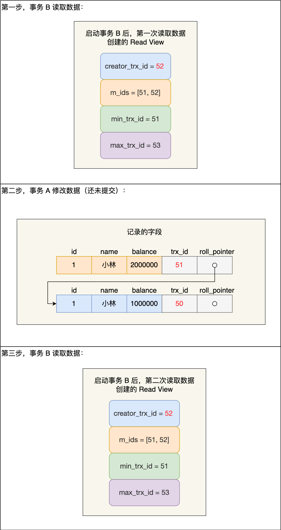 那具体怎么做到的呢?我们重点看事务 B 每次读取数据时创建的 Read View。前两次 事务 B 读取数据时创建的 Read View 如下图: