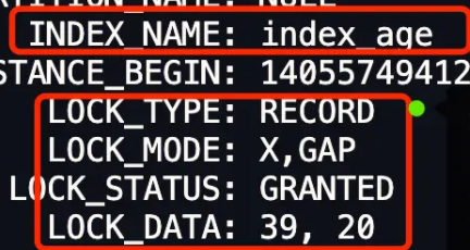 - LOCK_DATA 第一个数值,也就是 39, 它代表的是 age 值。从前面我们也知道了,LOCK_DATA 第一个数值是 next-key 锁和间隙锁锁住的范围的右边界值。