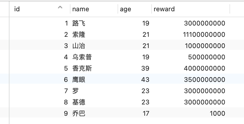 现在有一张用户表(t_user),表里只有一个主键索引,表里有以下行数据: