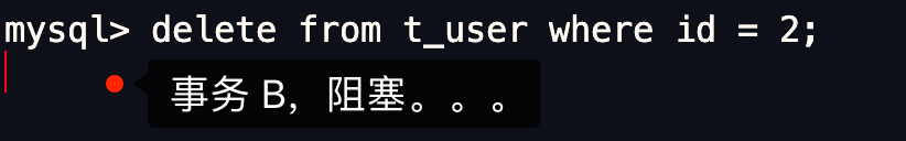 然后, B 事务执行了一条删除 id = 2 的语句: