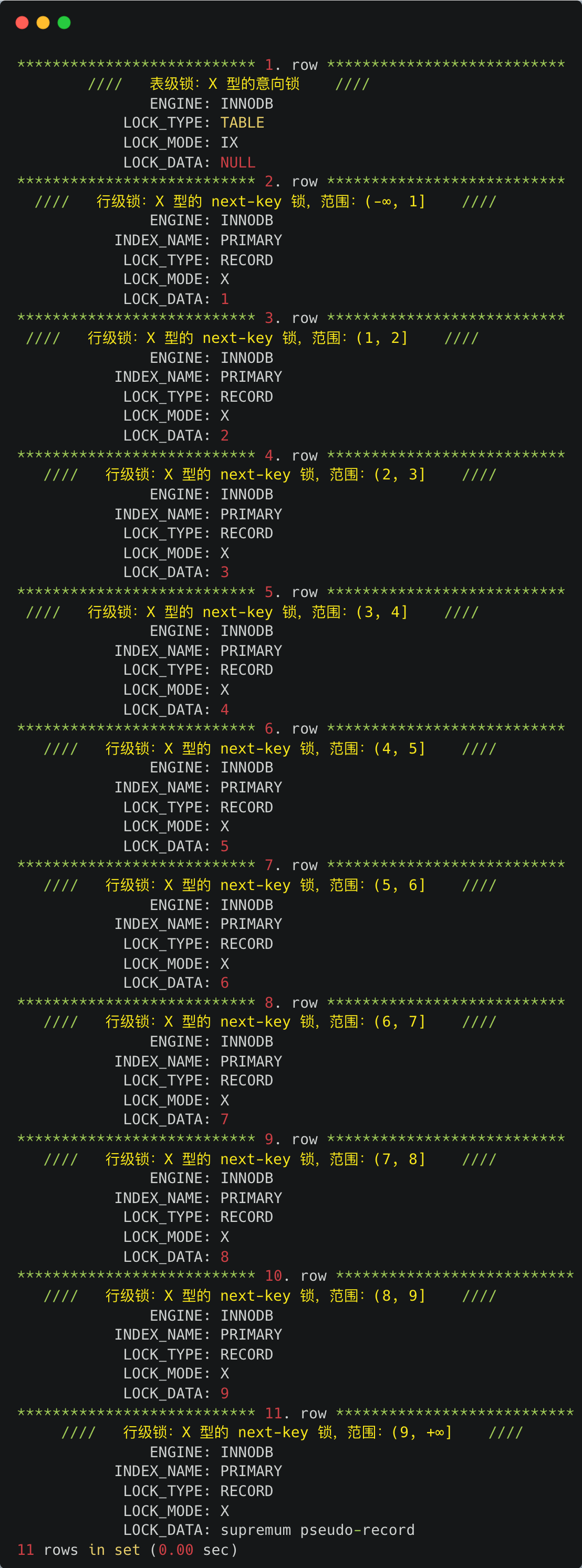 - 根据我的经验,如果 LOCK_MODE 是 next-key 锁或者间隙锁,那么 LOCK_DATA 就表示锁的范围最右值,而锁范围的最左值为 LOCK_DATA 的上一条记录的值。