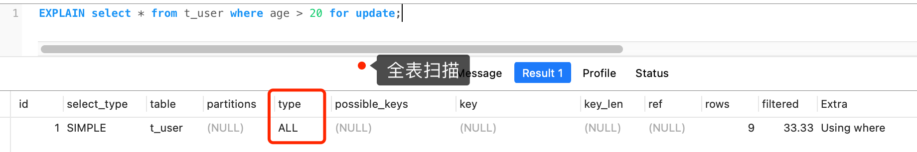 这是因为事务 A 的这条查询语句是全表扫描,锁是在遍历索引的时候加上的,并不是针对输出的结果加锁。