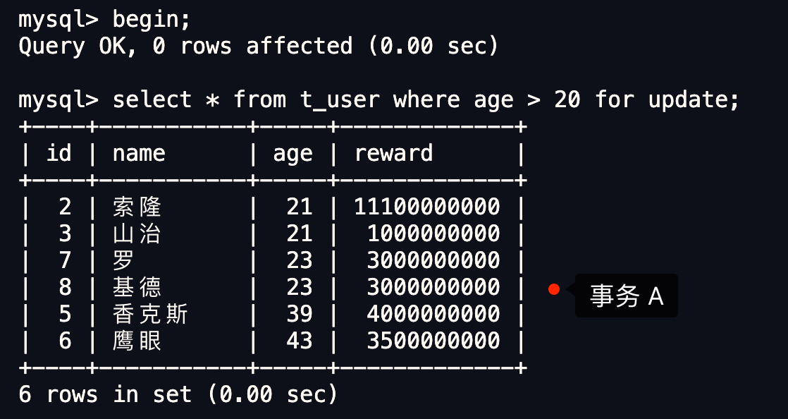现在有一个 A 事务执行了一条查询语句,查询到年龄大于 20 岁的用户共有 6 条行记录。