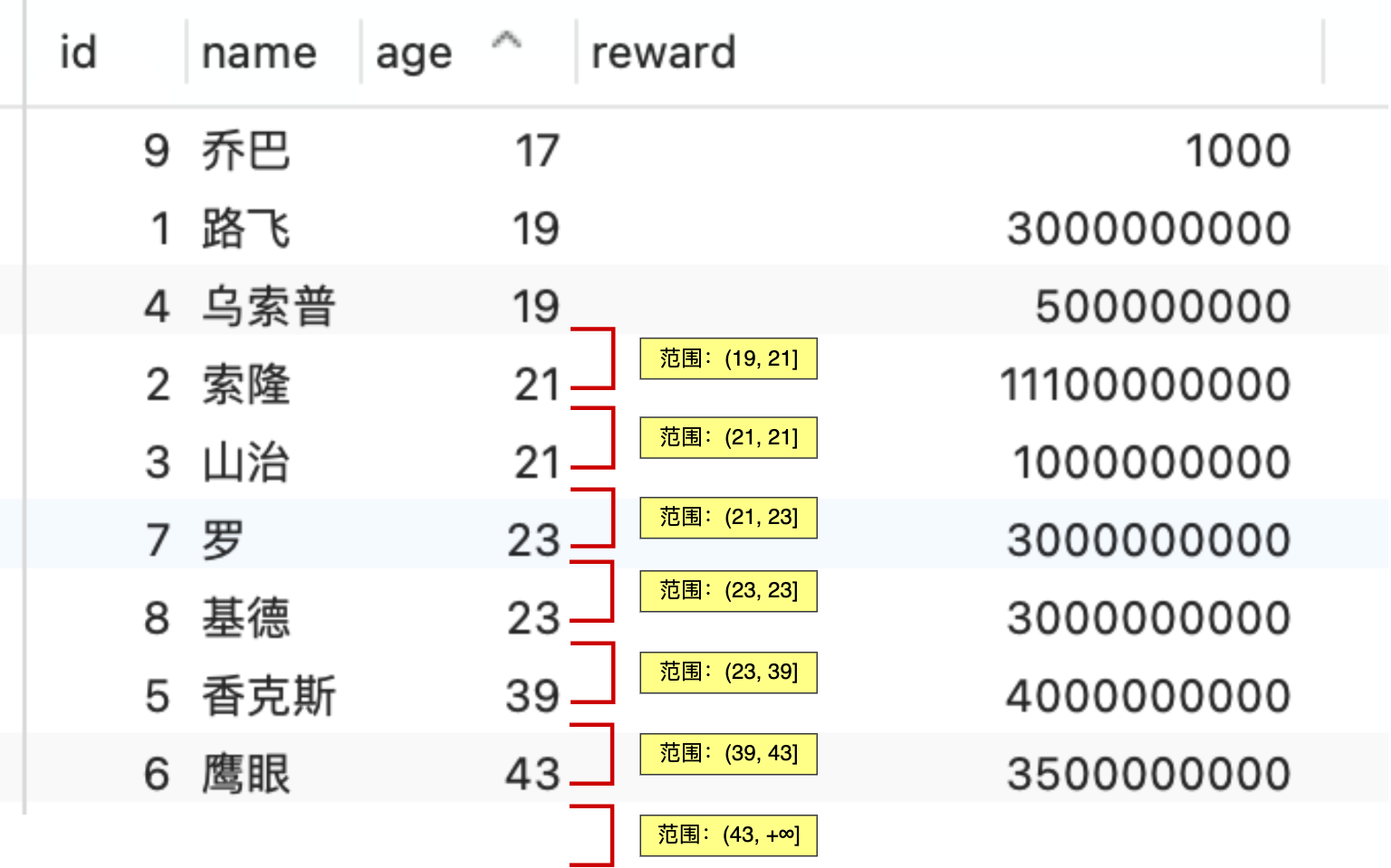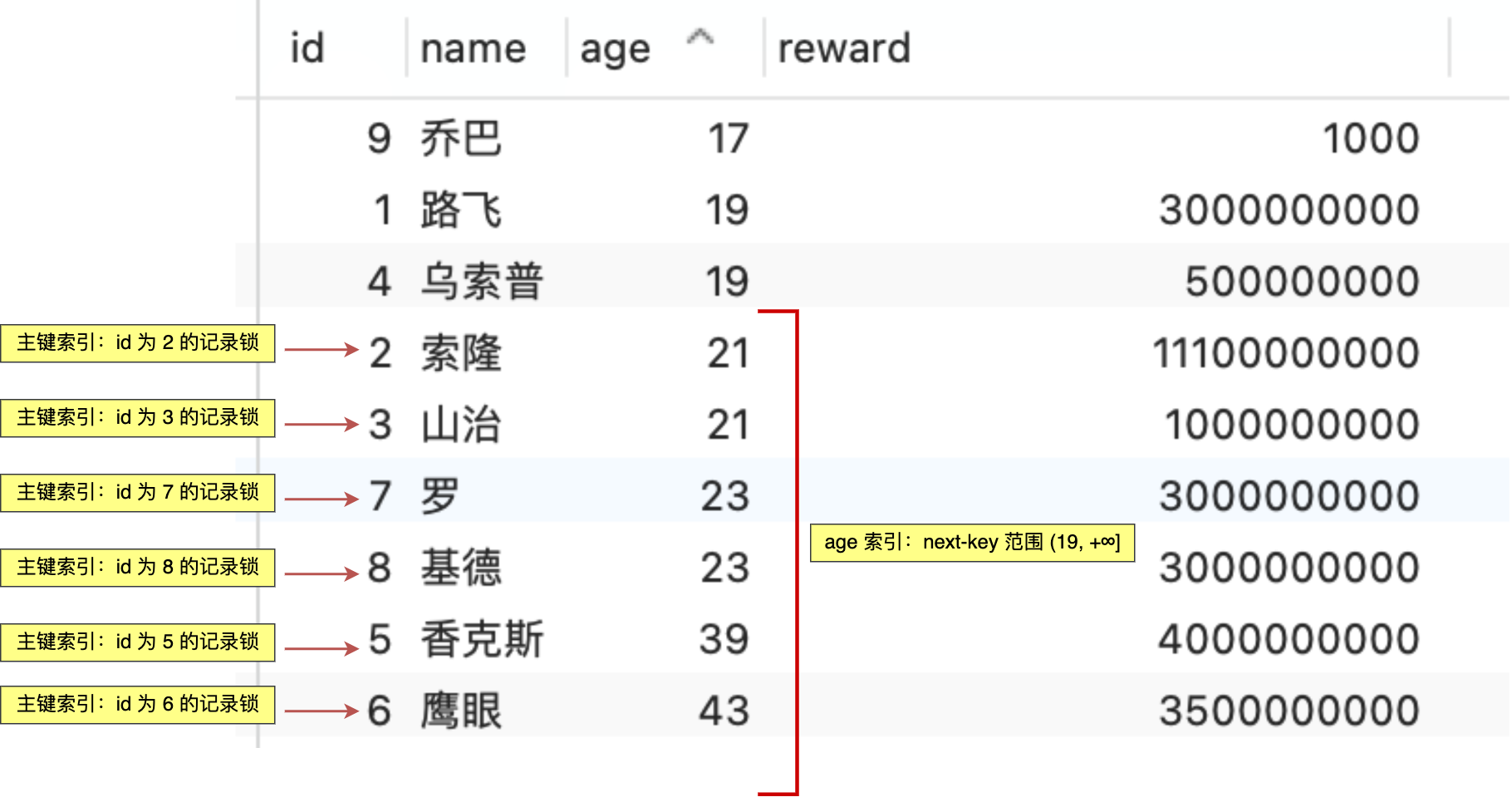 分析 age 索引加锁的范围时,要先对 age 字段进行排序。