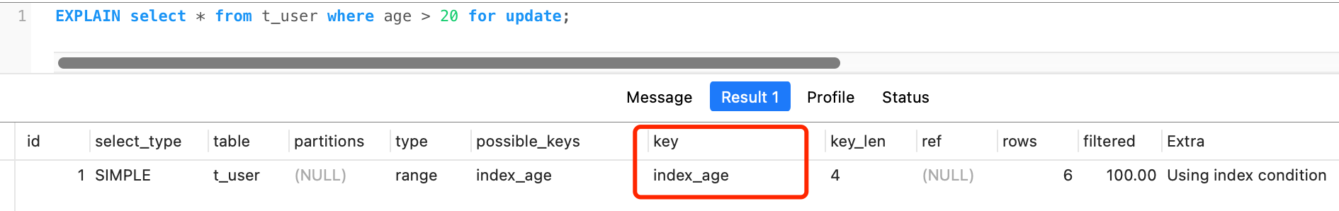 接下来,我对 age 字段建立索引,然后再执行这条查询语句:
