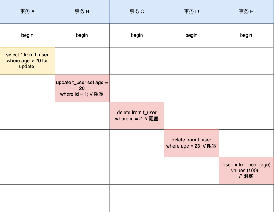 事务 A 加上锁后,事务 B、C、D、E 在执行以下语句都会被阻塞。