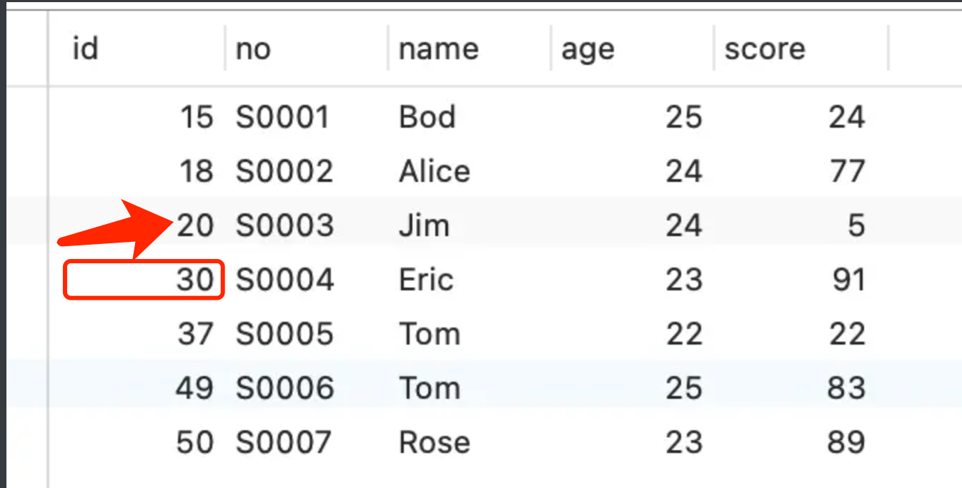 然后锁范围的最左值是 t_student 表中 id 为 30 的上一条记录的 id 值,即 20。