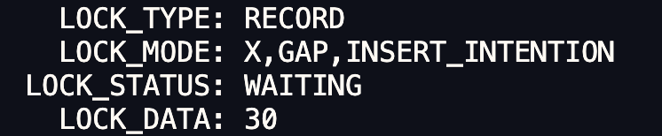 根据我的经验,如果 LOCK_MODE 是 next-key 锁或者间隙锁,那么 LOCK_DATA 就表示锁的范围最右值,此次的事务 A 的 LOCK_DATA 是 30。