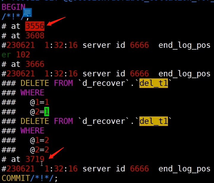 比如上面解析出的Binlog,误操作开始的位点可以认为是3556,结束的位点是3719