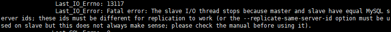 这个在我们刚接触主从复制的时候可能会犯的错误,也就是主从的 server_id 配置成相等的了,show slave status\G 会报如下错误: