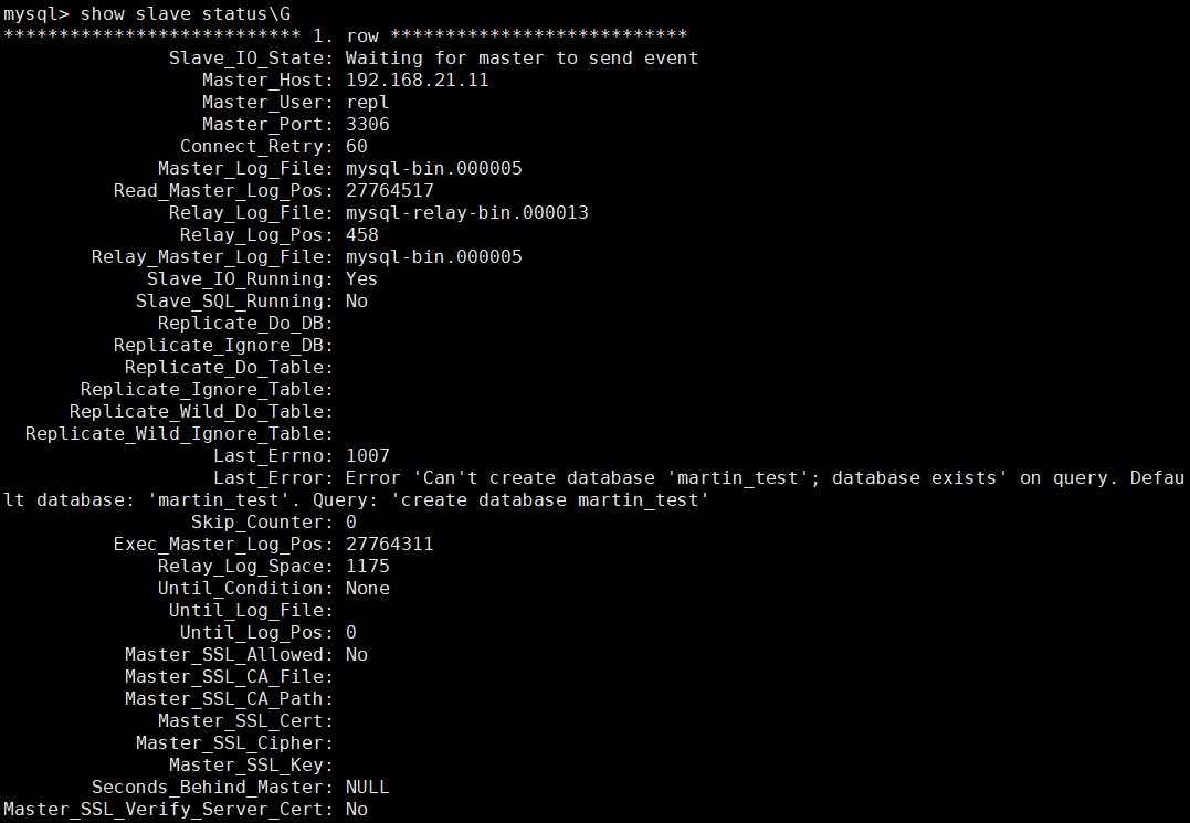 Last_Error 中提示了,不能再创建 martin_test 库,因为已经存在了。