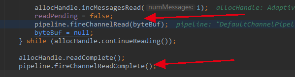 数据读完之后,调用 pipeline.fireChannelRead(byteBuf); 从head节点开始传播至整个pipeline